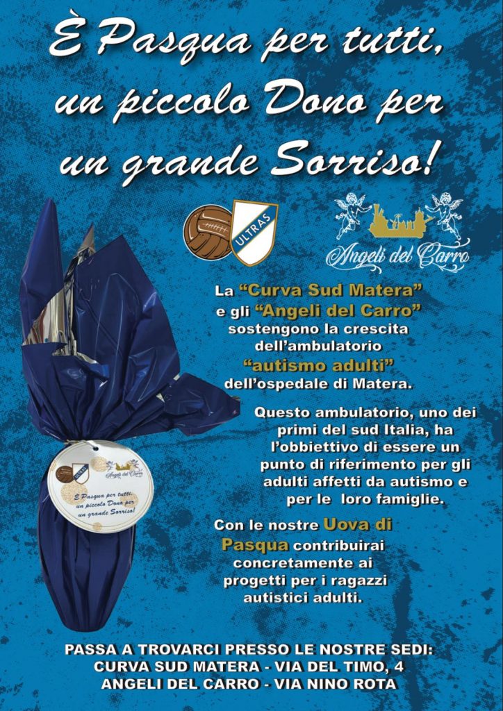 Con l’arrivo della Pasqua torniamo a segnalare una lodevole iniziativa della Curva Sud Matera, in collaborazione con gli Angeli del Carro. Il ricavato della vendita delle uova di Pasqua verrà devoluto all’ambulatorio “Autismo adulti” dell’Ospedale “Madonna delle Grazie” di Matera. Le uova possono essere acquistate presso le due sedi indicate nella locandina.